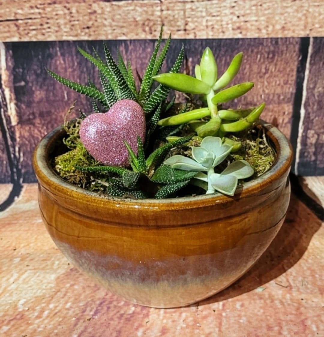 Show your love with this ceramic container filled with a variety of succulents. Succulents are hardy, need little water, and are perfect for growing in containers, making this an ideal gift for all seasons.